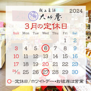 2024.02.23 3月の定休日のお知らせ 3月は6日、27日にお休みをいただく予定です。 ホワイトデー前日の13日は営業し、ハートかりんとう饅頭を販売します。 お彼岸期間は休まず営業致します。 よろしくお願いいたします。