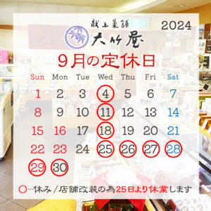 2024.08.25 9月の定休日のお知らせ 9月は◯の日にお休みをいただく予定です。 店舗のリニューアル改装の為、9/25より休業致します。 休業の詳細につきましては、後ほどお知らせ致しますので、 よろしくお願いいたします。